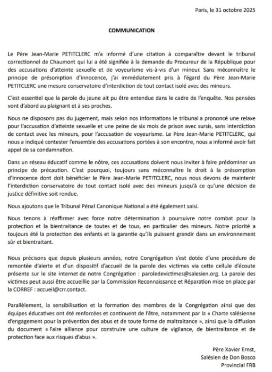 Suite à la condamnation en première instance de Jean Marie Petitclerc à Chaumont pour « voyeurisme » à six mois de prison avec sursis – il a fait appel, les Salésiens de Don Bosco communiquent et indiquent notamment :